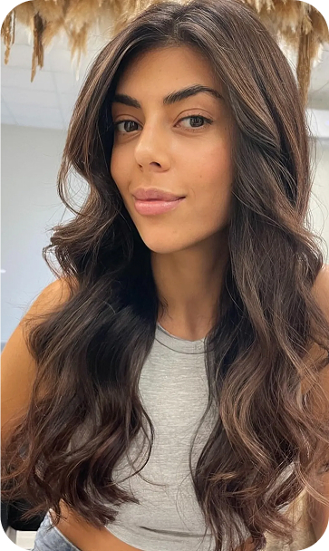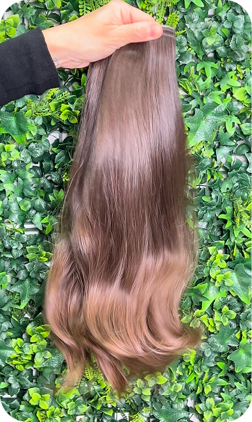 Trabajo con extensiones de cinta adhesiva, la técnica más recomendada por dermatólogos por ser rápida, segura y respetuosa con tu cabello natural. Uso cabello 100 % natural brasileño, sin químicos, con puntas llenas que aportan volumen real y un movimiento espectacular. En menos de una hora puedes llevar una melena más larga, suave y brillante, sin que nadie note que llevas extensiones. Y con un mantenimiento fácil cada 45 días, lucir perfecta será más sencillo que nunca.